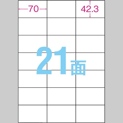 商品仕様 | ●サイズ/A4 ●シートサイズ/210×297mm ●ラベルサイズ/42.3×70mm ●面付け/21面 ●カット内容/3列×7段 ●紙質/上質紙 ●総厚み/0.14mm ●白色度/91% ●その他仕様/●対応機種:インクジェット、カラーレーザー、モノクロレーザー、モノクロコピー ●備考/※厚紙モード、手差し給紙でお使いください。 ※お使いの機種によっては対応しない場合がございます。 |