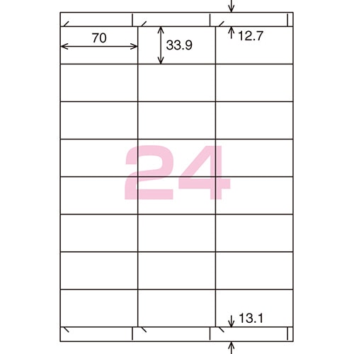 商品仕様 | ●サイズ/A4 ●シートサイズ/210×297mm ●ラベルサイズ/33.9×70mm ●面付け/24面 ●紙質/上質紙 ●坪量/134g/m2 ●ラベルの厚み/0.07mm ●総厚み/0.14mm ●白色度/約95% ●古紙パルプ配合率/0.7 ●備考/※厚紙モード、手差し給紙でお使いください。また、お使いの機種によっては対応しない場合がございます。 |