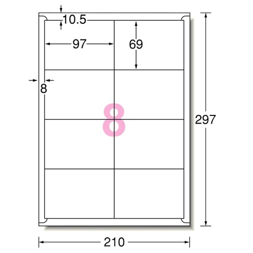 | 商品仕様 | ●サイズ/A4 ●シートサイズ/210×297mm ●ラベルサイズ/69×97mm ●面付け/8面 ●紙質/上質紙 ●坪量/160g/m2 ●ラベルの厚み/0.11mm ●総厚み/0.22mm ●白色度/91% ●紙色/ホワイト ●重量/225g ●備考/※厚紙モード、手差し給紙でお使いください。また、お使いの機種によっては対応しない場合がございます。なお、素材によってははがす時に粘着剤が残ったり、表面を傷める場合があります。 |