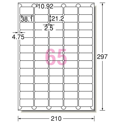 | 商品仕様 | ●サイズ/A4 ●シートサイズ/210×297mm ●ラベルサイズ/21.2×38.1mm ●面付け/65面 ●紙質/上質紙 ●坪量/160g/m2 ●ラベルの厚み/0.11mm ●総厚み/0.22mm ●白色度/91% ●紙色/ホワイト ●重量/225g ●備考/※厚紙モード、手差し給紙でお使いください。また、お使いの機種によっては対応しない場合がございます。なお、素材によってははがす時に粘着剤が残ったり、表面を傷める場合があります。 |