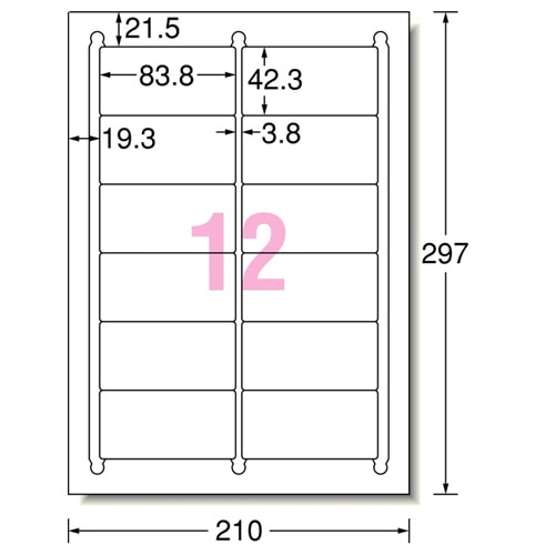 商品仕様 | ●サイズ/A4 ●シートサイズ/210×297mm ●ラベルサイズ/42.3×83.8mm ●面付け/12面 ●紙質/上質紙 ●坪量/175g/m2 ●ラベルの厚み/0.13mm ●総厚み/0.19mm ●白色度/98% ●紙色/ホワイト ●重量/1120g ●備考/※厚紙モード、手差し給紙でお使いください。お使いの機種によっては対応しない場合がございます。 ※インクジェットプリンタの場合、にじみが生じる場合がございます。 |