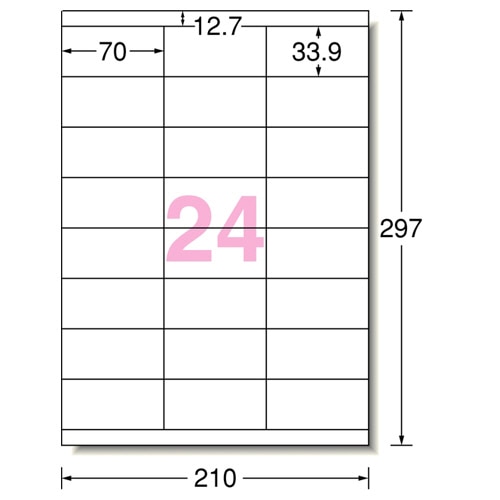 商品仕様 | ●サイズ/A4 ●シートサイズ/210×297mm ●ラベルサイズ/33.9×70mm ●面付け/24面 ●紙質/上質紙 ●坪量/175g/m2 ●ラベルの厚み/0.13mm ●総厚み/0.19mm ●白色度/98% ●紙色/ホワイト ●重量/1120g ●備考/※厚紙モード、手差し給紙でお使いください。お使いの機種によっては対応しない場合がございます。 ※インクジェットプリンタの場合、にじみが生じる場合がございます。 |