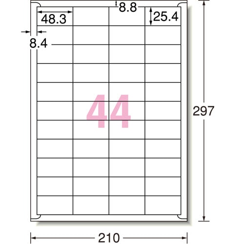 商品仕様 | ●サイズ/A4 ●ラベルサイズ/25.4×48.3mm ●面付け/44面 ●カット内容/四辺余白付 ●総厚み/0.19mm ●白色度/98% ●備考/※コピー・レーザープリンター使用の場合は厚紙モード・手差し給紙でお使いください。お使いの機種によっては対応しない場合がございます。 ※インクジェットプリンタはにじみが生じる場合がございます。 |