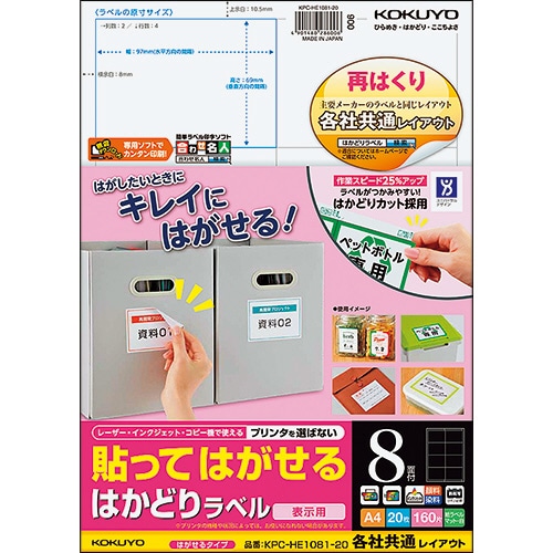 コクヨ 貼ってはがせる はかどりラベル(各社共通レイアウト) A4 8面 69×97mm KPC-HE1081-20N 1冊(20シート)