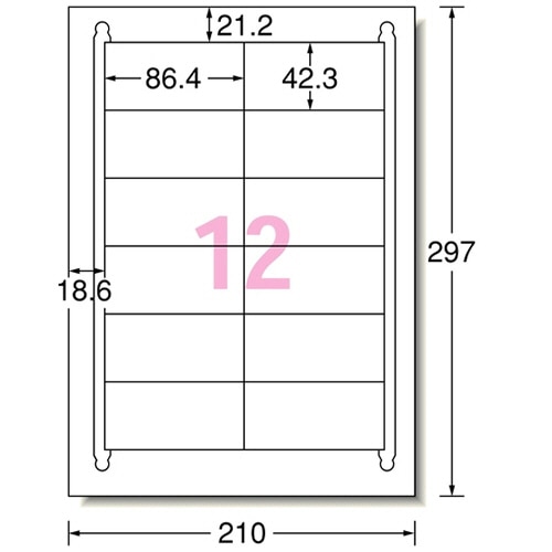 商品仕様 | ●サイズ/A4 ●シートサイズ/210×297mm ●ラベルサイズ/42.3×86.4mm ●面付け/12面 ●カット内容/2列×6段 ●坪量/180g/m2 ●ラベルの厚み/0.14mm ●総厚み/0.20mm ●白色度/98% ●紙色/白 ●下地が隠せる/○ ●その他仕様/●片数:144片入 ●備考/※顔料インクでは、表面素材の特性上、インクが乾きにくいので、印刷面にはできるだけ触れないようにしてください。 ※厚紙モード、手差し給紙でお使いください。 ※お使いの機種によっては対応しない場合がございます。 |