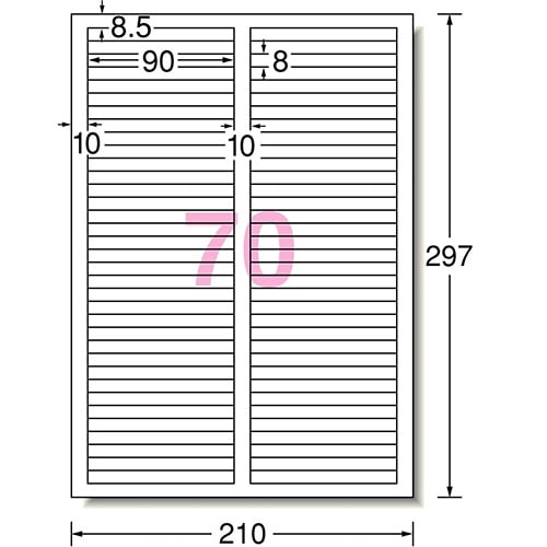 商品仕様 | ●サイズ/A4 ●シートサイズ/210×297mm ●ラベルサイズ/8×90mm ●面付け/70面 ●カット内容/2列×35段 ●坪量/180g/m2 ●ラベルの厚み/0.14mm ●総厚み/0.20mm ●白色度/98% ●紙色/白 ●下地が隠せる/○ ●その他仕様/●片数:840片入 ●備考/※顔料インクでは、表面素材の特性上、インクが乾きにくいので、印刷面にはできるだけ触れないようにしてください。 ※厚紙モード、手差し給紙でお使いください。 ※お使いの機種によっては対応しない場合がございます。 ※上下余白部分に、横幅カット用の目盛りが印刷されています。 |