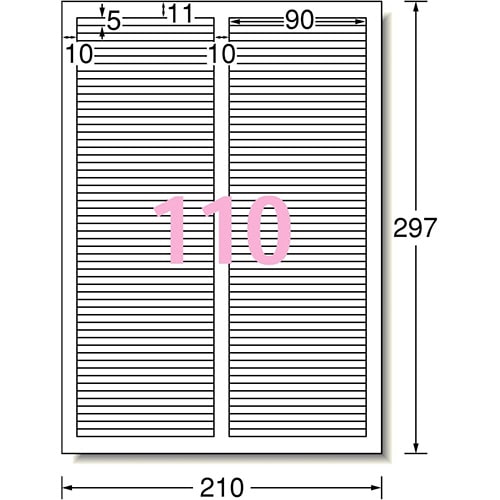 商品仕様 | ●サイズ/A4 ●シートサイズ/210×297mm ●ラベルサイズ/5×90mm ●面付け/110面 ●カット内容/2列×55段 ●坪量/180g/m2 ●ラベルの厚み/0.14mm ●総厚み/0.20mm ●白色度/98% ●紙色/白 ●下地が隠せる/○ ●その他仕様/●片数:1320片入 ●備考/※顔料インクでは、表面素材の特性上、インクが乾きにくいので、印刷面にはできるだけ触れないようにしてください。 ※厚紙モード、手差し給紙でお使いください。 ※お使いの機種によっては対応しない場合がございます。 ※上下余白部分に、横幅カット用の目盛りが印刷されています。 |