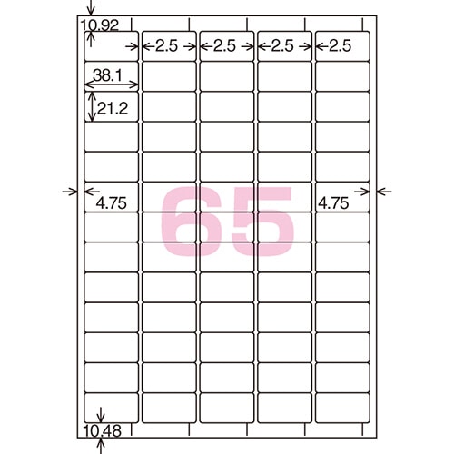商品仕様 | ●サイズ/A4 ●シートサイズ/210×297mm ●ラベルサイズ/21.2×38.1mm ●面付け/65面 ●紙質/上質紙 ●坪量/134g/m2 ●ラベルの厚み/0.07mm ●総厚み/0.14mm ●白色度/85%程度 ●紙色/白無地 ●その他仕様/●片数:6500片入 ●備考/※用紙種類が選択できる機種で「ラベル紙」または「厚紙」に設定し、印刷してください。 ※記載のソフトは、予告なく変更になる場合があります。 ※用紙厚さ121g/m2以上に対応する機種でお使いください。前面給排紙タイプのプリンタでは紙送りができない場合があります。 ※厚紙モード、手差し給紙でお使いください。また、お使いの機種によっては対応しない場合がございます。 |