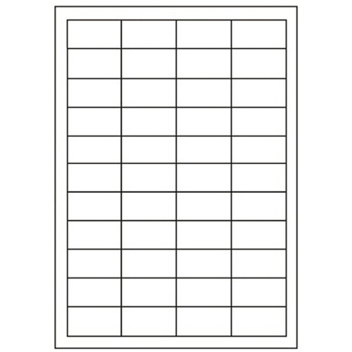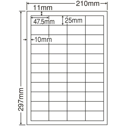 商品仕様 | ●サイズ/A4 ●シートサイズ/210×297mm ●ラベルサイズ/25×47.5mm ●面付け/44面 ●紙質/マットフィルム ●坪量/124g/m2 ●総厚み/113μm ●紙色/ホワイト ●水に強い/○ ●屋外用/○ ●備考/※カラー印刷の場合は長時間の紫外線により色あせする場合がございます。 |