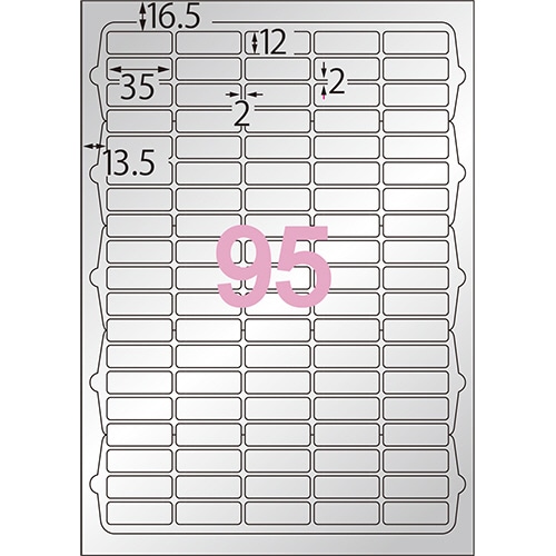 商品仕様 | ●サイズ/A4 ●シートサイズ/210×297mm ●ラベルサイズ/12×35mm ●面付け/95面 ●カット内容/四辺余白 ●紙質/ポリエステルフィルム ●ラベルの厚み/0.08mm ●総厚み/0.15mm ●紙色/シルバー ●水に強い/○ ●屋外用/○ ●備考/※手書きでご使用の場合は油性マーカーをおすすめします。ゴム印をご使用の場合は金属、プラスチック、ガラスなど非吸収面になつ印できるスタンプインクを選び、なつ印後は充分に乾かしてください。 ※爪などの固いものこすると印影がはがれる場合があります。また、バーコードの印字はおすすめできません。 ※厚紙モード、手差し給紙でお使いください。 ※お使いの機種によっては対応しない場合がございます。 |