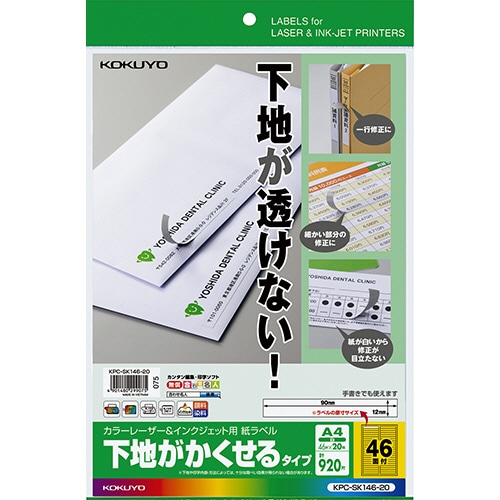 コクヨ カラーレーザー&インクジェット用 紙ラベル(下地がかくせるタイプ) A4 46面 12×90mm KPC-SK146-20 1冊(20シート)