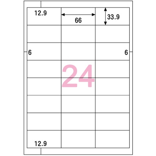 商品仕様 | ●サイズ/A4 ●シートサイズ/210×297mm ●ラベルサイズ/33.9×66mm ●面付け/24面 ●カット内容/四辺余白 ●総厚み/約0.15mm ●白色度/約120% ●備考/※モノクロコピー、モノクロレーザー、カラーコピー、カラーレーザーでは、厚紙モード・手差し給紙でお使いください。お使いの機種によっては対応しない場合がございます。 ※インクジェットでは、にじみが生じる場合がございます。 |