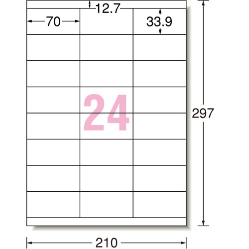 | 商品仕様 | ●サイズ/A4 ●ラベルサイズ/33.9×70mm ●面付け/24面 ●カット内容/上下余白付 ●総厚み/0.15mm ●再剥離/○ ●その他仕様/●手書き対応 ●備考/※コピー・レーザープリンター使用の場合は厚紙モード・手差し給紙でお使いください。お使いの機種によっては対応しない場合がございます。 ※インクジェットプリンタはにじみが生じる場合がございます。 |