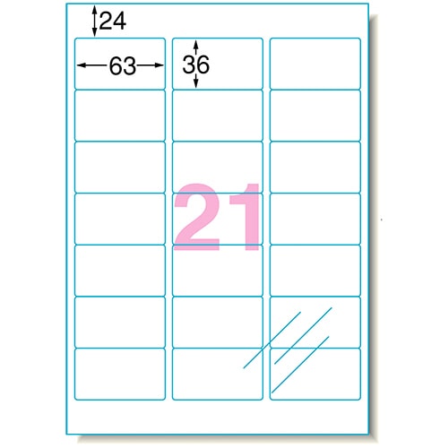 | 商品仕様 | ●タイプ/透明保護フィルム ●サイズ/A4変型 ●ラベルサイズ/タテ36×ヨコ63mm ●ラベルの厚さ/0.05mm ●材質/ポリプロピレン ●その他仕様/●面付け:21面(3列×7段) ●シートサイズ:210×300mm ●総厚み:0.14mm ●坪量:130g/m2 |