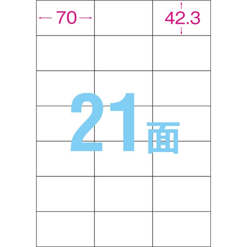 商品仕様 | ●サイズ/A4 ●シートサイズ/210×297mm ●ラベルサイズ/42.3×70mm ●面付け/21面 ●紙質/上質紙 ●総厚み/0.13mm ●白色度/82% ●強粘着/○ ●その他仕様/●強粘着タイプ ●手書き対応 ●備考/※厚紙モード・手差し給紙でお使いください。 ※機種によっては対応しない場合がございます。 |