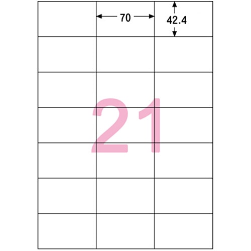 商品仕様 | ●サイズ/A4 ●シートサイズ/210×297mm ●ラベルサイズ/42.4×70mm ●面付け/21面 ●総厚み/約0.15mm ●白色度/約120% ●備考/※モノクロコピー、モノクロレーザー、カラーコピー、カラーレーザーでは、厚紙モード・手差し給紙でお使いください。お使いの機種によっては対応しない場合がございます。 ※インクジェットでは、にじみが生じる場合がございます。 |