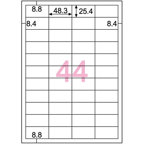 商品仕様 | ●サイズ/A4 ●シートサイズ/210×297mm ●ラベルサイズ/25.4×48.3mm ●面付け/44面 ●カット内容/四辺余白 ●総厚み/約0.15mm ●白色度/約120% ●備考/※モノクロコピー、モノクロレーザー、カラーコピー、カラーレーザーでは、厚紙モード・手差し給紙でお使いください。お使いの機種によっては対応しない場合がございます。 ※インクジェットでは、にじみが生じる場合がございます。 |