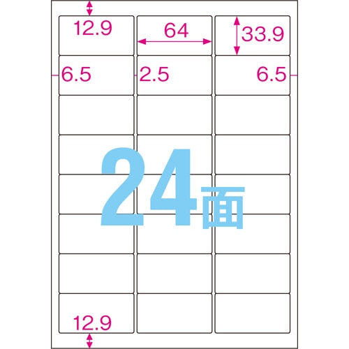 商品仕様 | ●サイズ/A4 ●シートサイズ/210×297mm ●ラベルサイズ/33.9×64mm ●面付け/24面 ●紙質/半光沢ホワイトフィルム ●総厚み/0.23mm ●紙色/白 ●材質/ラベル材質:PETフィルム ●水に強い/○ ●強粘着/○ ●屋外用/○ ●その他仕様/●強粘着フィルムラベル |