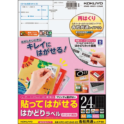 コクヨ 貼ってはがせる はかどりラベル(各社共通レイアウト) A4 24面 33.9×66mm KPC-HE1242-20N 1冊(20シート)