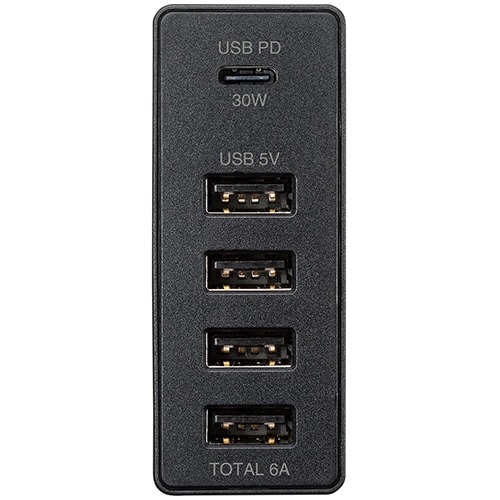 | 商品仕様 | ●コネクタ形状(本体)/出力:USB Type-C×1、USB A×4 ●電源/AC100V 50/60Hz ●ケーブル長さ/AC電源コード:約1m ●寸法/W約101×D28×H71mm ●重量/約200g ●色/ブラック ●出力電圧/電流/[USB Type-C]DC5V/3A・DC9V/3A・DC12V/2.5A・DC15V/2A・DC20V/1.5A(最大30W)、[USB A]DC5V/6A(4ポート合計最大) ●付属品/AC電源コード ●保証期間/6ヶ月 ●備考/※出力電圧/電流は接続する機種により自動で切り替わります。 |