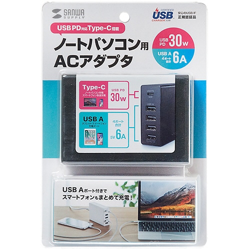 サンワサプライ USB Power Delivery対応AC充電器 5ポート 合計60W ブラック ACA-PD57BK 1個