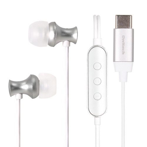 ●かんたんに再生・停止などの操作ができるリモコンと通話に便利なマイクがついたUSB Type-Cイヤホン「OWL-EPC01」、本体色はシルバーです。