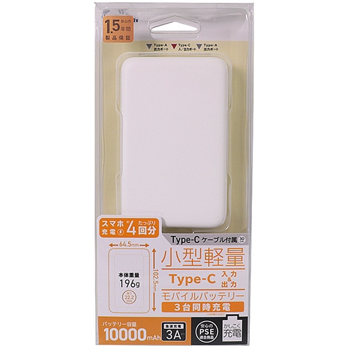 ●最大3Aの入出力に対応したUSB Type-Cポートを搭載した容量10000mAhのモバイルバッテリー。カラーはホワイトです。