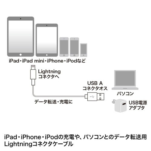| 商品仕様 | ●コネクタ形状/ライトニングコネクタ(オス)-USB Aコネクタ(オス) ●ケーブル長さ/約1m ●色/ホワイト ●その他仕様/●対応端末・機器:ライトニング端子を持つApple社製純正デバイス ●対応パソコン:USBポートを持つ各社パソコン ●対応ACアダプタ:各機種に対応しているUSB-ACアダプタ ●重量:約28g ●ケーブル直径:約3.3mm ●備考/※ケーブル長さはSR間。(SR:コネクタ後端とケーブルのつなぎ目を保護するパーツ) ※本体ケースを使用している場合に、コネクタが差さらない場合がありますので、その時には本体ケースを外してご使用ください。 ※パソコン本体のUSBポートから充電を行うにはハイパワーUSBポートに接続してください。USBポートがハイパワーUSBポートではない場合には、iPad mini・iPad Air・iPadに接続しても充電できません。 ※対応機種の詳細につきましてはメーカーホームページをご確認ください。 |