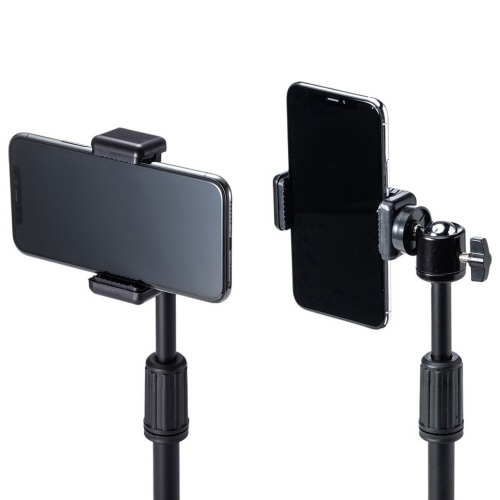 ●スマートフォンを取り付けできるホルダー付きです。ボールジョイントで、画面の縦向き・横向きどちらにも対応します。