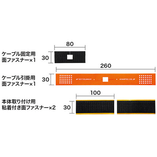 | 商品仕様 | ●材質/ケーブル引っ掛け用面ファスナー/ポリエステル、ケーブル固定用面ファスナー(ホール有)/ポリエステル、本体取り付け用面ファスナー粘着付き/ポリエステル ●その他仕様/●寸法:ケーブル引っ掛け用面ファスナー/W260×H30mm、ケーブル固定用面ファスナー/W80×H30mm、本体取り付け用面ファスナー粘着付き/W100×H30mm ●重量:ケーブル引っ掛け用面ファスナー/2g、ケーブル固定用面ファスナー/1g、本体取り付け用面ファスナー粘着付き/4g ●パック内容:ケーブル引っ掛け用面ファスナー×1枚、ケーブル固定用面ファスナー(ホール有)×1枚、本体取り付け用面ファスナー粘着付き×2枚 ●電源ケーブルプラグ差し込み部直径:14mm |