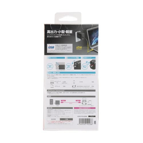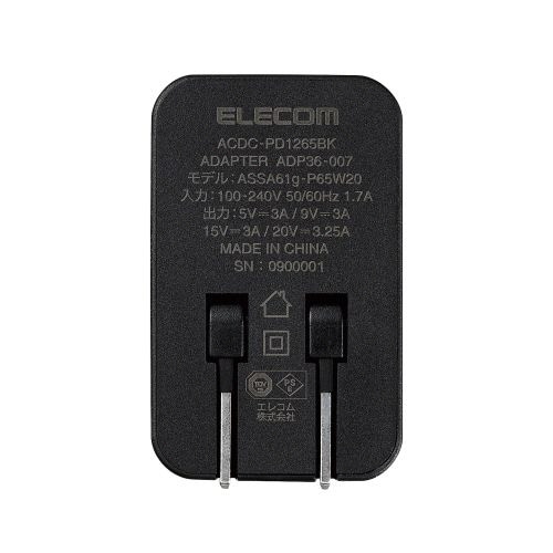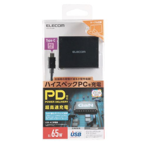 エレコム GaN PD対応 USB AC充電器(PD65W/2mケーブル付属) ブラック ACDC-PD1265BK 1個