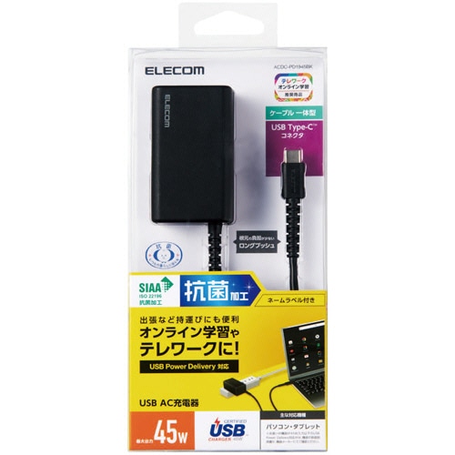 エレコム USB PowerDelivery 45W AC充電器(抗菌/Cケーブル一体型/2m) ブラック ACDC-PD1945BK 1個