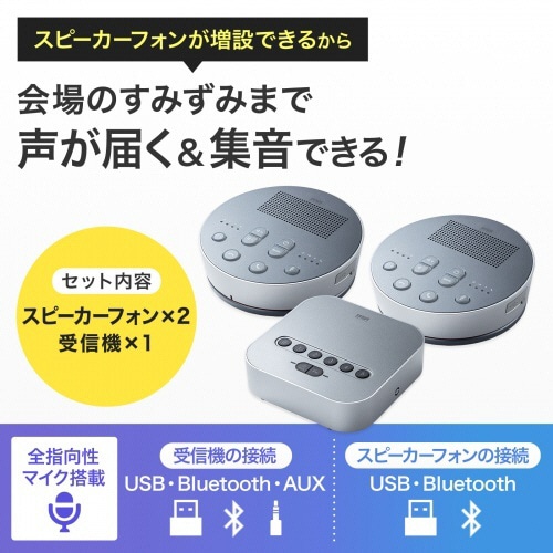 商品仕様 | ●接続方法/Bluetooth 5.0、USB、3.5mmステレオミニプラグ ●ヘッドフォン周波数帯域/2.402~2.480GHz ●ボリューム調整/あり ●指向性/全指向性 ●その他仕様/●サイズ:[受信機]約W118×D118×H33mm、[スピーカーフォン]約W125×D125×H37mm ●重量:[受信機]約150g、[スピーカーフォン]約420g ●電源:[受信機]USB給電、[スピーカーフォン]リチウムポリマーバッテリー ●マイク集音範囲:1台あたり1.5m ●スピーカー実用最大出力:3W ●対応コーデック:SBC ●通信距離:10m ●対応プロファイル:HSP、HFP、A2DP、AVRCP ●充電ポート:microUSB ●対応OS:Windows 10、mac OS11、macOS 10.12~10.15 Mac OS X 10.6~10.11 ●セット内容:本体(受信機)、取扱説明書(保証書)、USBケーブル(1.8m)×3、オーディオケーブル(1.8m)×2、スピーカーフォン×2 ●保証期間/1年 |