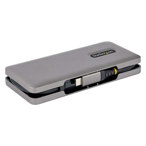 ●13.5×6.2×2cmの小型で耐久性のあるプラスチック筐体。オフィスのデスク、会議室、ホームオフィスなどで移動する際にケーブルの絡まりを防ぐ25cm巻き取り式ホストケーブルを内蔵した4ポートUSB Type-Cハブ。