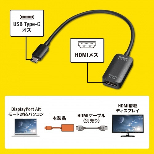 DisplayPort Altmodeに対応したType-CポートをHDMI(4K/30Hz)に変換し映像出力ができる変換アダプタ。