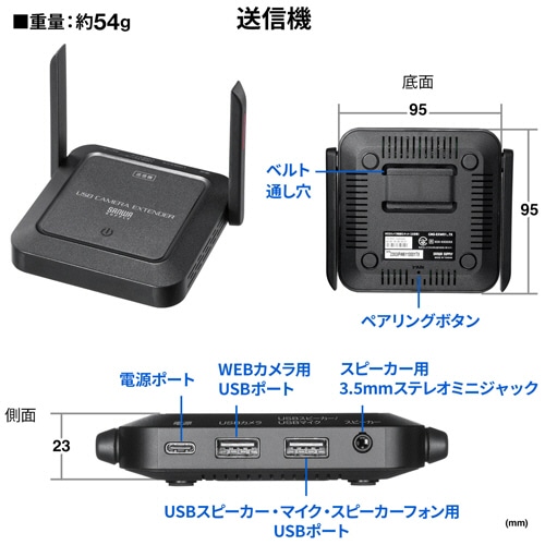 商品仕様 | ●その他仕様/●無線伝送距離:最大25m ●寸法:[送信機]約W95×D95×H23mm(アンテナ部分含まず)、[受信機]約W67×D67×H21mm ●質量:[送信機]約54g、[受信機]約32g ●USB接続 ●付属品:ACアダプタ、ベルクロストラップ他 ●保証期間:6ヵ月 |