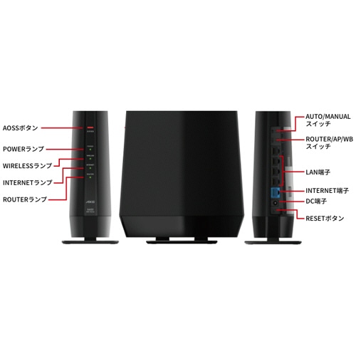 | 商品仕様 | ●無線LAN規格/Wi-Fi 6(11ax/ac/n/a/g/b) ●データ転送速度/4803Mbps(5GHz)+573Mbps(2.4GHz)(理論値) ●WANポート数/1Gbps×1ポート ●LANポート数/1Gbps×4ポート ●USB/1ポート ●消費電力/14.6W(最大) ●寸法/W59×D177×H175mm ●重量/650g ●その他仕様/●色:黒 ●推奨利用環境:端末30台 ●OFDMA ●IPv6対応 ●ビームフォーミング ●バンドステアリング ●MU-MIMO ●付属品/スタンド、ACアダプター、LANケーブル(0.5m)他 ●保証期間/1年 |