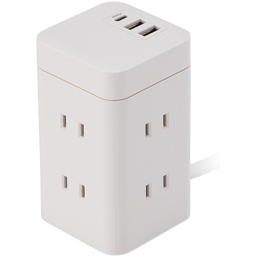 商品仕様 | ●コンセント仕様/2P ●コンセント数/6個口 ●プラグ形状/スイングプラグ ●定格容量/AC100V 14A 合計1400Wまで ●ケーブル長さ/1m ●雷ガード/対応 ●寸法/W60×D60×H105mm ●その他仕様/●USBポート:USB-A×2、USB-C(PD)×1 ●備考/※寸法はコード含まず。 |