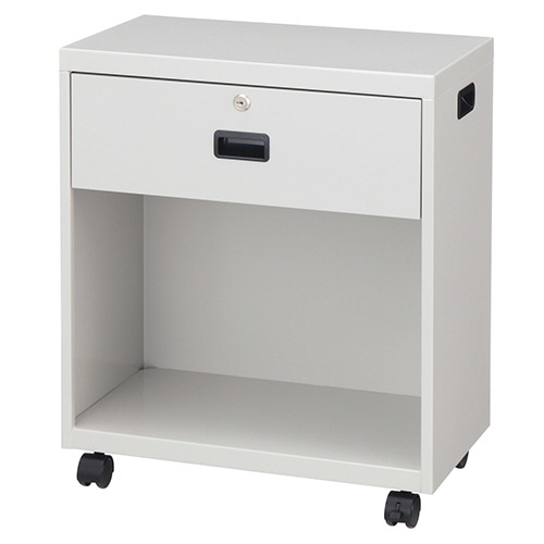 商品仕様 | ●タイプ/コンビ ●外寸/W500×D286×H600mm ●重量/8.2kg ●色/ニューグレー ●有効内寸/引出:幅424×奥行246×高143mm、収納部:幅470×奥行280×高330mm ●耐荷重/天板:10kg、底板:15kg ●材質/本体:スチール(粉体焼付塗装)、取手:スチロール、キャスター:ナイロン(ストッパー付2個) ●脚部仕様(キャスター/アジャスター)/キャスター ●カギ/シリンダー錠 ●製造国/日本 ●付属品/スパナ、カギ2本 ●その他仕様/●引出付 |