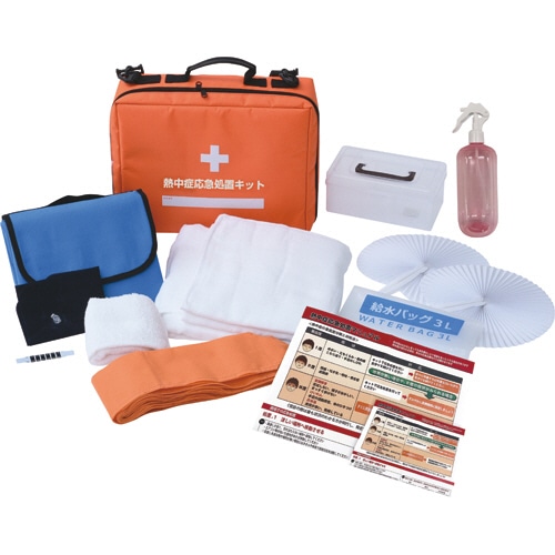 | 商品仕様 | ●寸法/W340×H270×D135mm ●重量/約3000g ●その他仕様/●セット内容:ショルダーバッグ、折畳マット、冷却用ガーゼ、瞬間冷却材、給水バッグ、応急マニュアル、小物ケース、表面温度チェッカー、冷却帯、エアクッション、折畳うちわ、フェイスタオル、霧吹き ●備考/※本製品は熱中症の応急処置を目的とした製品になります。熱中症を治すものではありません。熱中症を疑った場合はすぐに応急処置を行い医療機関を受診しましょう。 |