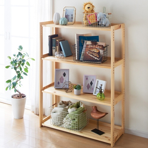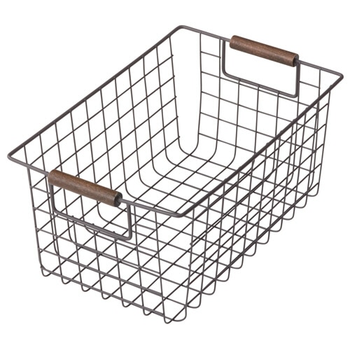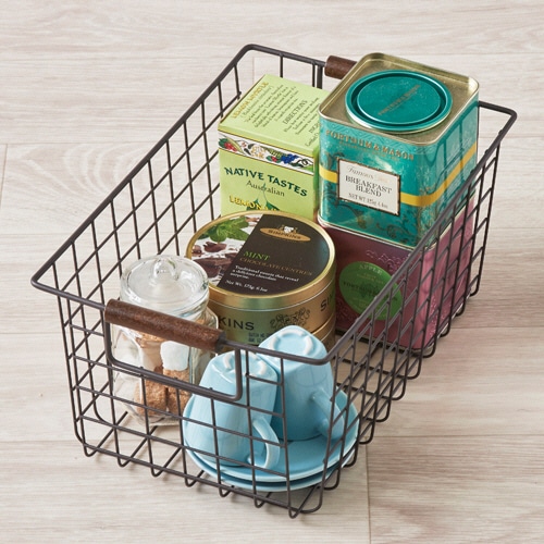 ●シンプルなデザインでリビングやキッチンなどいろいろな場所でスッキリ収納できるワイヤーバスケット。木柄の色はブラウンです。