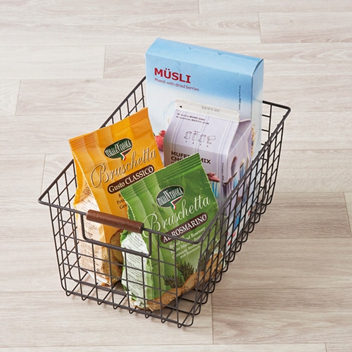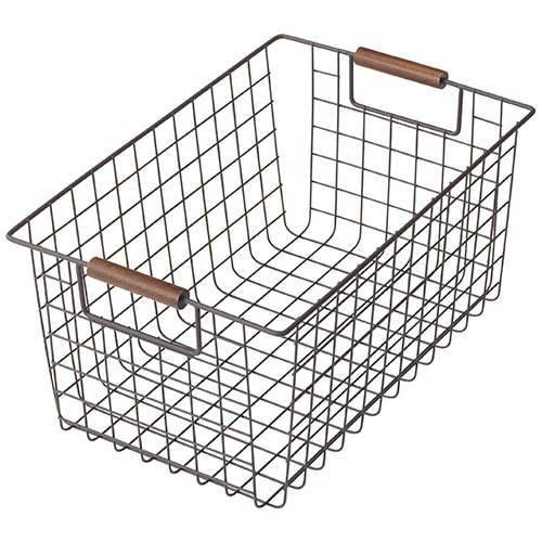 ●シンプルなデザインでリビングやキッチンなどいろいろな場所でスッキリ収納できるワイヤーバスケット、Mサイズ・ブラウンです。