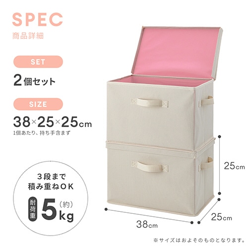 | 商品仕様 | ●寸法/W38×D25×H25cm ●耐荷重/約5kg ●色/ベージュピンク ●材質/本体生地:ポリプロピレン不織布、中材:厚紙 ●製造地/中国 ●その他仕様/●積み重ね:3段まで ●備考/※寸法は1個あたり、持ち手含まず。 |