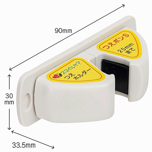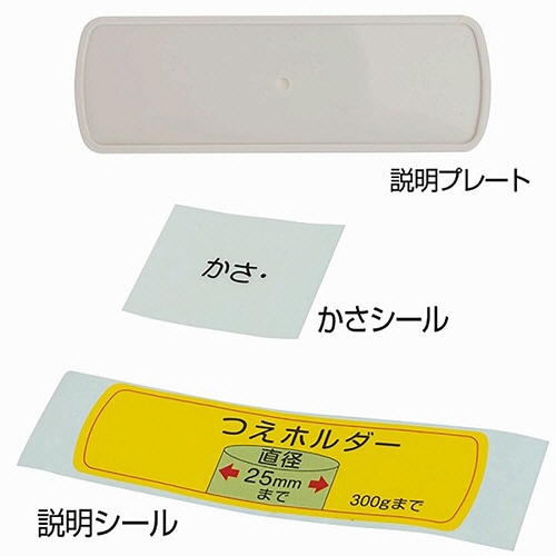 | 商品仕様 | ●種類/杖ホルダー ●重量/25g ●材質/本体:ABS樹脂、バネ:ステンレス ●付属品/説明プレート×1、説明シール×1、かさシール×1 ●その他仕様/●外寸:W90×D33.5×H30mm ●対応杖:約Φ15~25mm ●ビス隠し穴:Φ3mm ●説明プレートサイズ:W90×D30×H2.5mm ●耐荷重:350g |