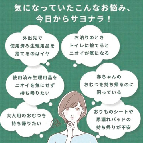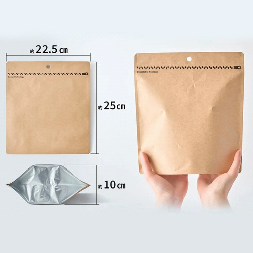 | 商品仕様 | ●寸法/タテ約25×ヨコ22.5×マチ10cm ●材質/PET、PE、アルミ、クラフト紙 ●その他仕様/●重量:40g ●1枚あたりの収納数:生理用品5~7個、大人用おむつ2~3枚、子ども用おむつ3~5枚 |