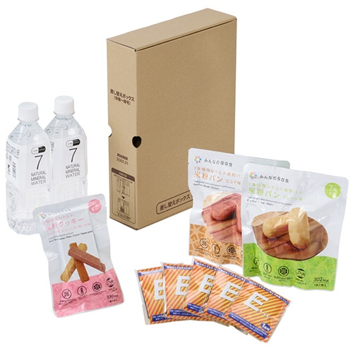 | 商品仕様 | ●セット内容/保存水(500mL)×2本、パン(2個入)×2袋、クッキー(3本入)×1袋、非常用簡易トイレ(汚物収納袋+抗菌性凝固剤)×5個 ●外寸/W約65×D220×H300mm ●重量/約1800g ●その他仕様/●賞味期限:5年(保存水・クッキー・パン) ●ハラール認証商品 |
