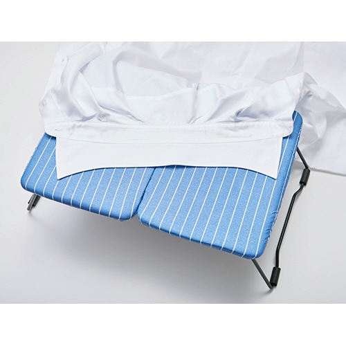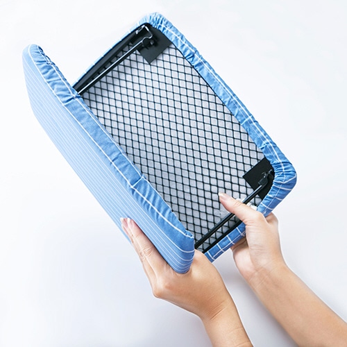 | 商品仕様 | ●重量/約1.1kg ●色/ストライプブルー ●材質/本体:スチール(粉体塗装)、カバー:綿100%(アルミコーティング)、クッション:ポリエステル、すべり止め:合成ゴム、収納ケース:ポリプロピレン ●その他仕様/●サイズ:A3サイズ使用時/約W46(掛け面42)×D30×H15cm、A4サイズ使用時/約W21×D30×H4.5cm |