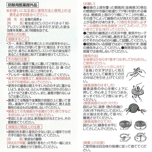 | 商品仕様 | ●効果/駆除 ●対象害虫/蚊成虫 ●有効成分/ピレスロイド(dl・d-T80-アレスリン) ●サイズ/W140×D140×H102mm ●その他仕様/●持続時間:約7時間 ●防除用医薬部外品 ●備考/※直射日光を避け、湿気の少ない涼しい場所で小児の手の届かない所に保管してください。 ※販売名:金鳥の渦巻a ●シリーズ名/金鳥の渦巻 |