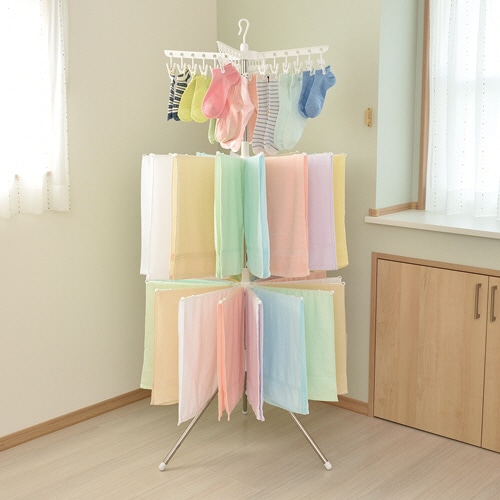 | 商品仕様 | ●寸法/W770×D770×H1690mm ●干す量の目安/フェイスタオル約32枚+靴下約12枚 ●重量/1.8kg ●耐荷重/10kg ●材質/本体:ステンレス巻きスチールパイプ、金属部品:スチール(メッキ)、樹脂部品:ポリプロピレン・ポリエチレン ●その他仕様/●3段S |
