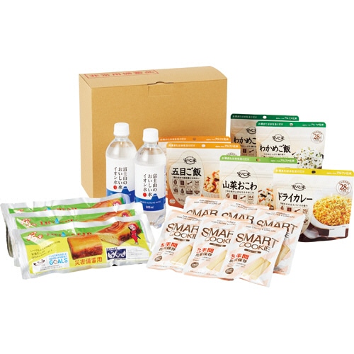 | 商品仕様 | ●セット内容/ライフブレッド(ブリオッシュ)×3袋、スマートクッキープレーン味×6袋、安心米わかめご飯・安心米五目ご飯×各2袋、安心米山菜おこわ・安心米ドライカレー×各1袋、富士山のおいしい水(500ml)×2本(調理用) ●外寸/W315×D140×H260mm ●重量/約2.9kg ●その他仕様/●保存期間:5年 ●備考/※セット内容は1人×3日分 ※外寸、重量は1セットあたり。 |